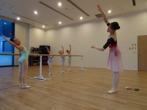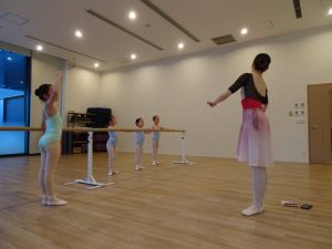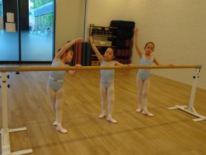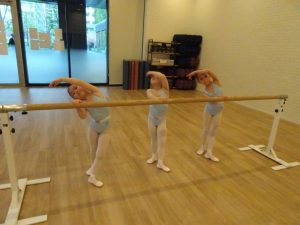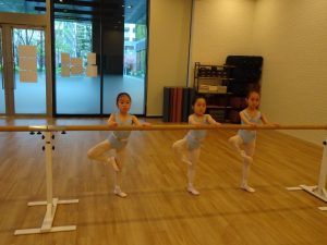 さらちゃんは、床を押して背中を上げたのをキープできるようにバーレッスンしましょう。