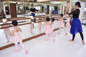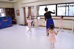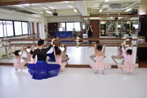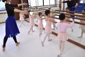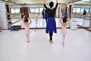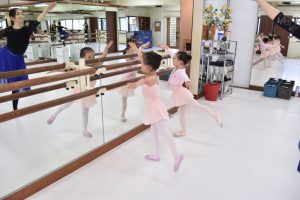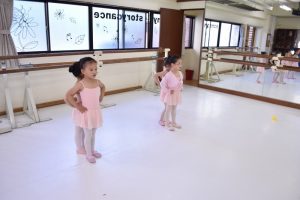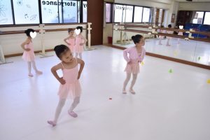 バーレッスンでは、まず、一番の足でまっすぐ立っていられるように、がんばりましょう。