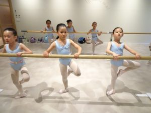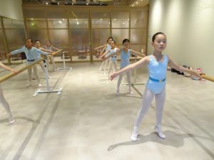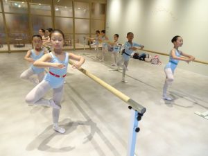 2、3年生は片手バーで、顔をつけながら軸足で床をしっかり押せるように。