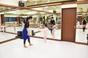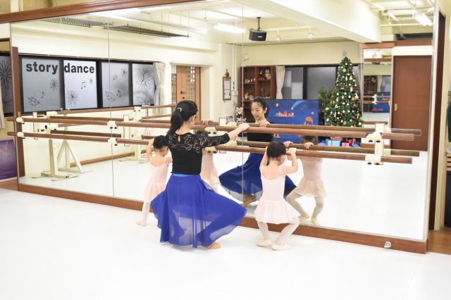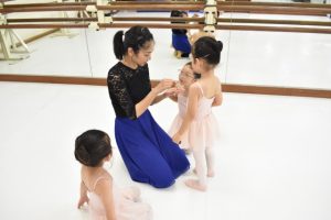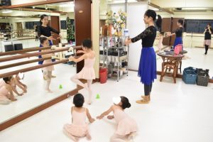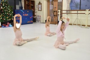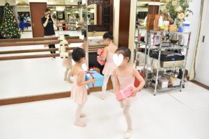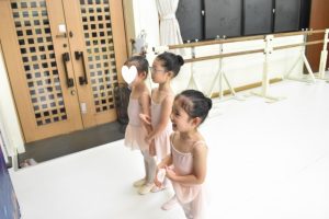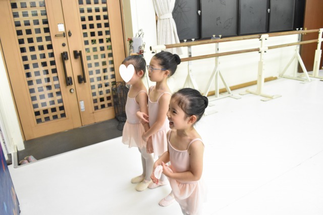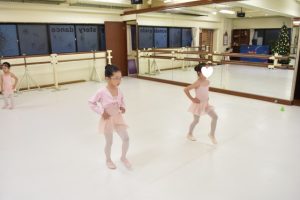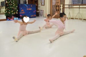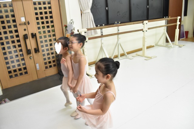 今日はりいちゃんとしえなちゃんには特に、プリエするときのお膝の向きを横向きにすることをお伝えし、練習しました。