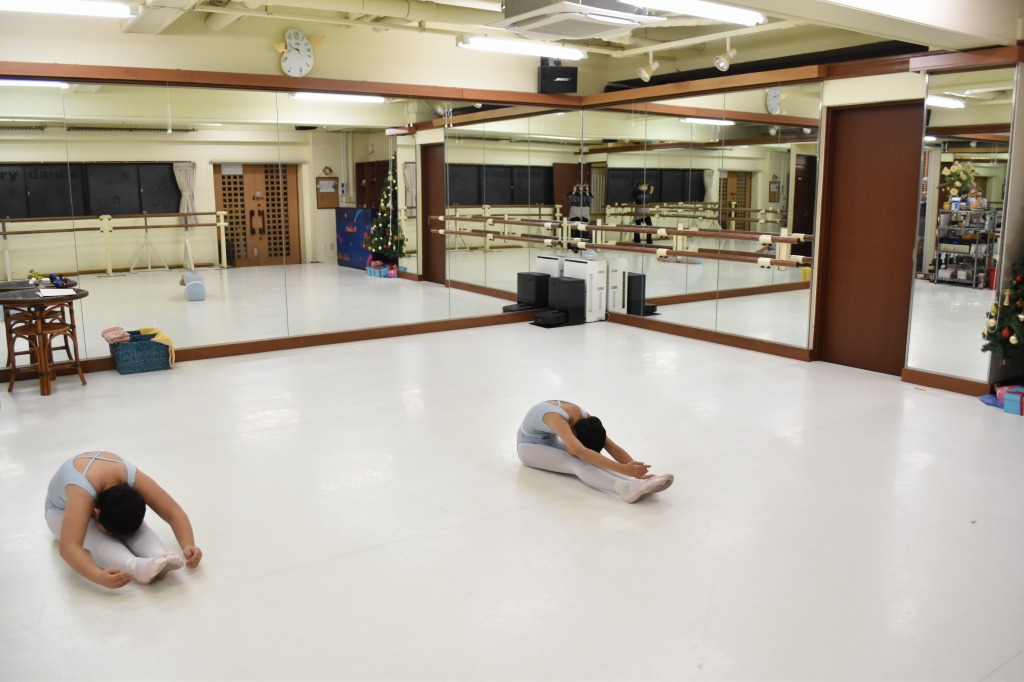 5番の最初のポジションと開いて2番で立った時のポジションにシールを貼りました🟥