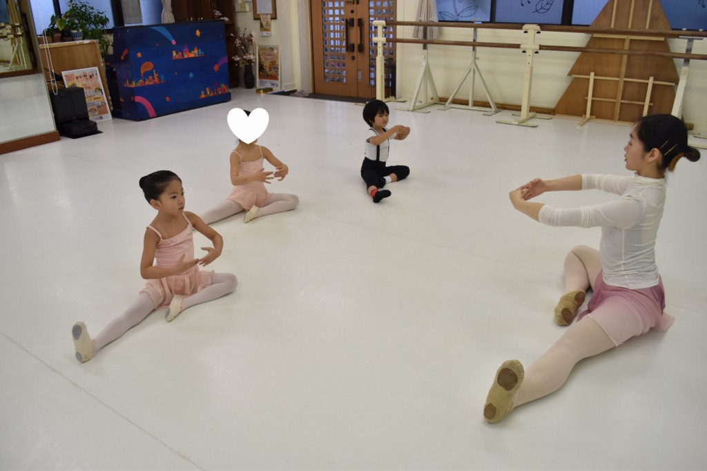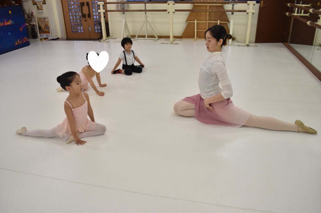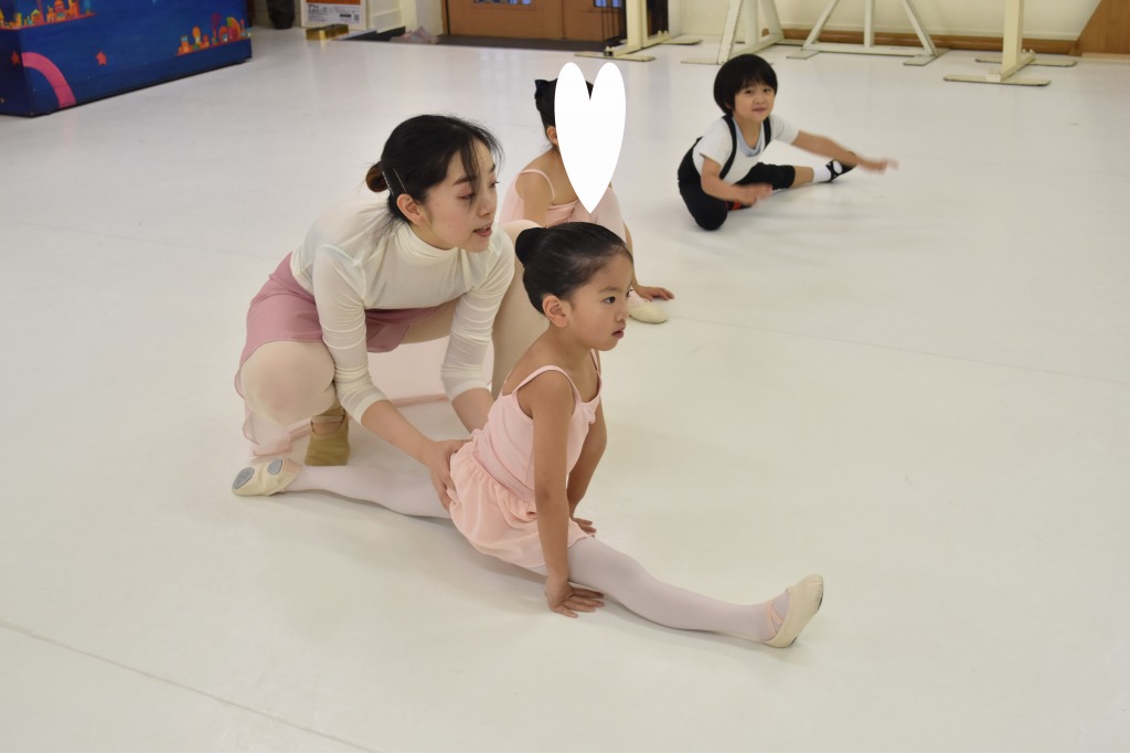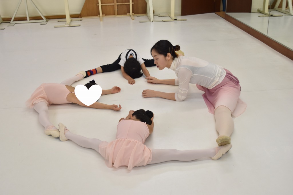 3人でしたので、横並びでストレッチをしたり、開脚はつま先を合わせて向かい合いました。