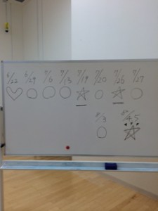 レッスンの回数を丸で、沢山の人前で踊る日を星で表してみました。