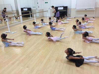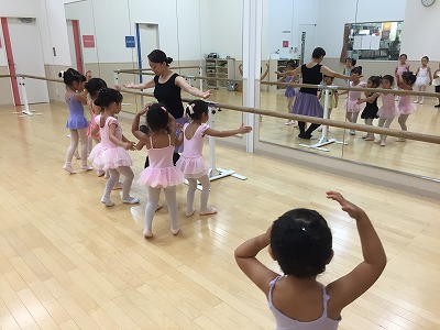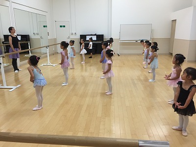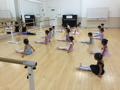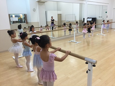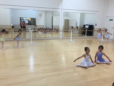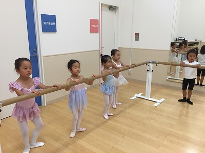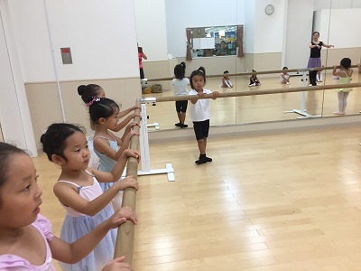 バーでは、年中さん年少さんは2組に分かれて交代でプリエとタンジュをやりました。