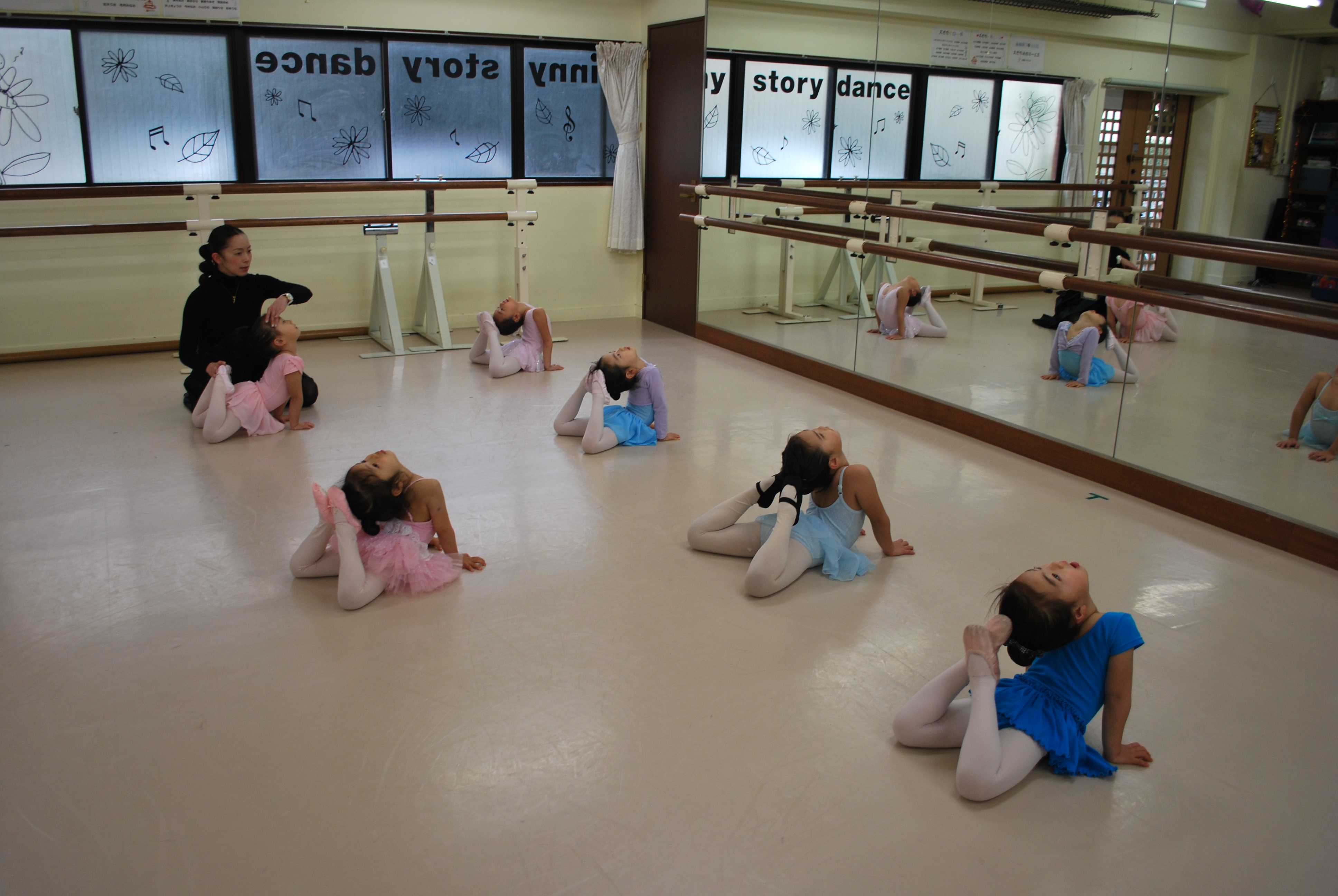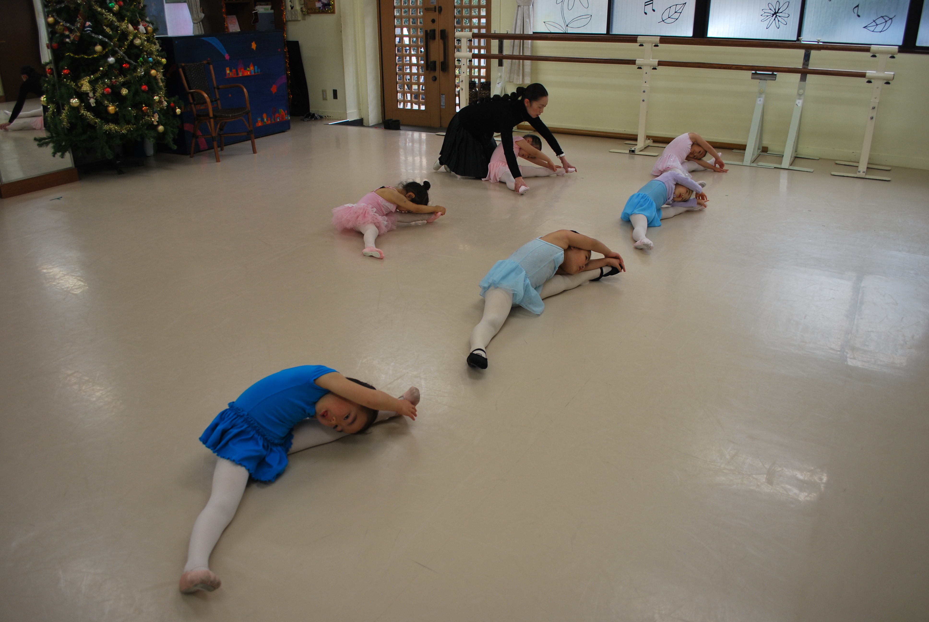 年少さんは講師とアシスタントでストレッチのお手伝いです。