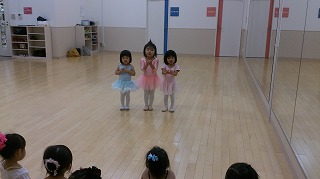 足は揃えて音に合わせて「きをつけ→お手手バッテンでお辞儀→きをつけ」と声をかけています。