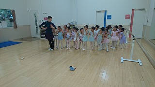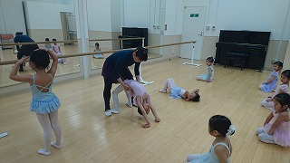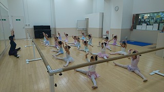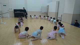 みなさん、プリエはピョコンとせずに丁寧にお膝を横に曲げましょう。
