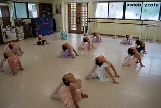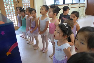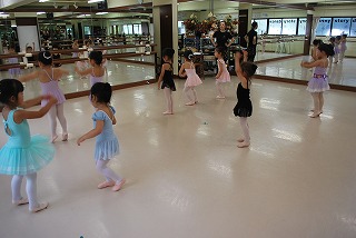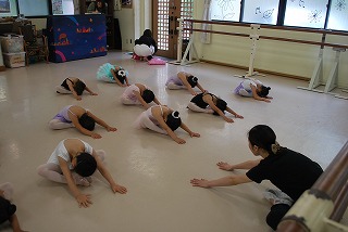 スキップのおひざを、おへそまで上げる練習と、ルルベは高~くすることを練習しました。