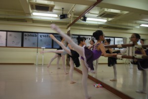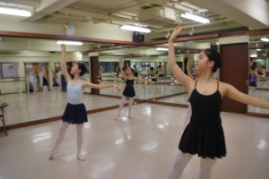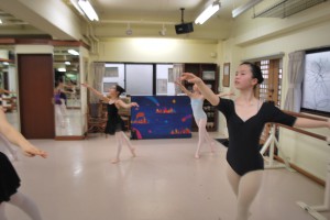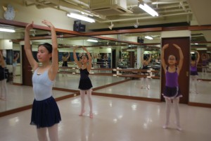 バーレッスンではアームスのアンオーの正しいポジション(目線と首すじ)の確認をしました。