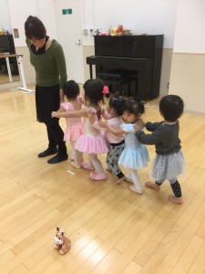 電車はお姉さんチームと妹さんチームに分かれてやりました。お姉さん達は手は腰にして並んで行進♬ 列からはみ出てはいけませんよ〜〜。